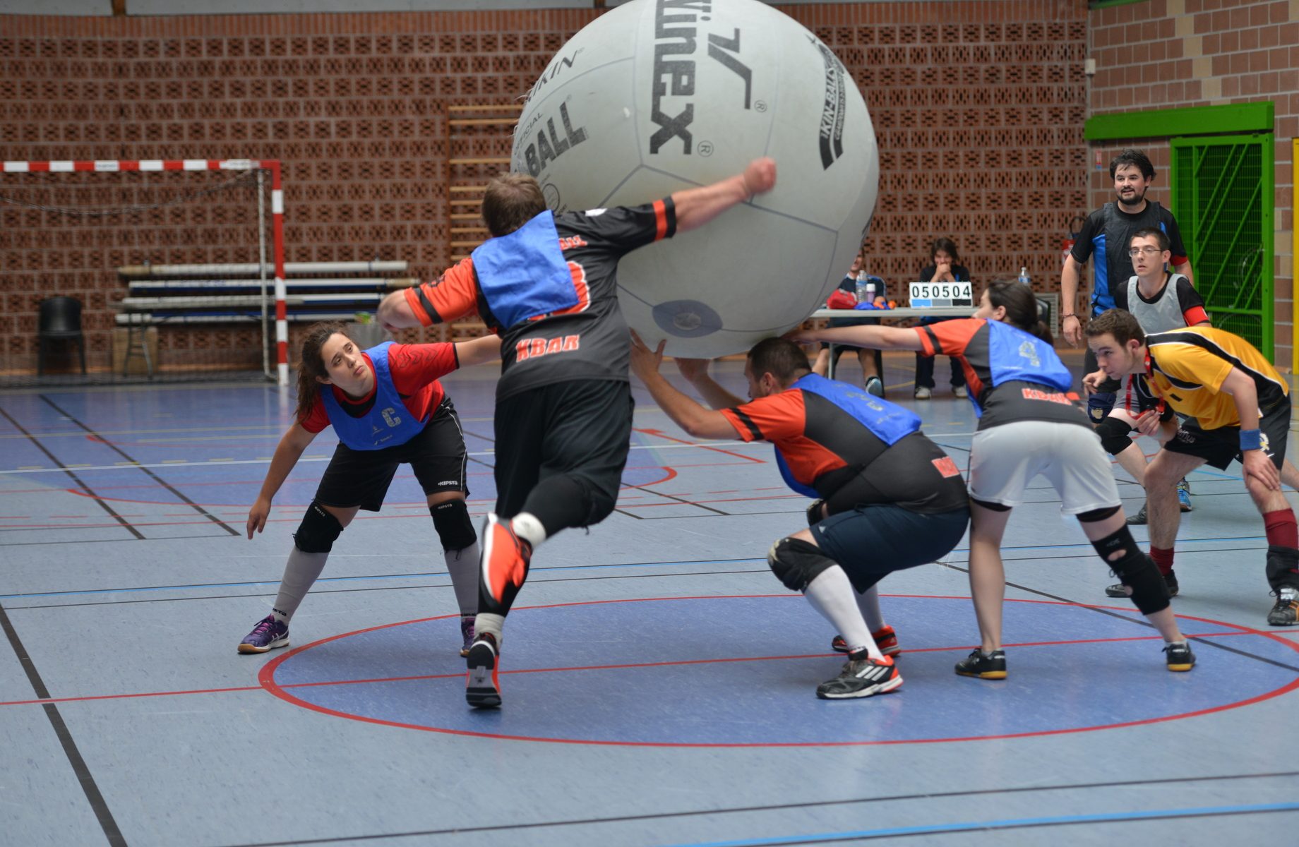 Le Kin-Ball est un sport d’équipe créé au Québec en 1987. C’est le seul sport au monde qui se joue à 3 équipes avec un gros ballon d’1,22m de diamètre et d’environ 1kg. Chaque équipe est composé de 4 joueurs qui évoluent sur un terrain carré de 21,4 mètre.